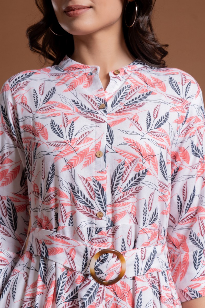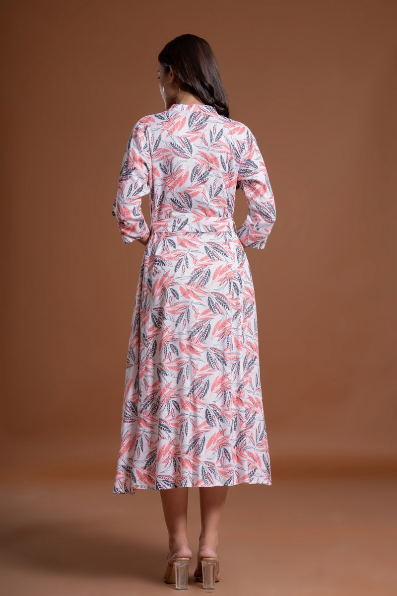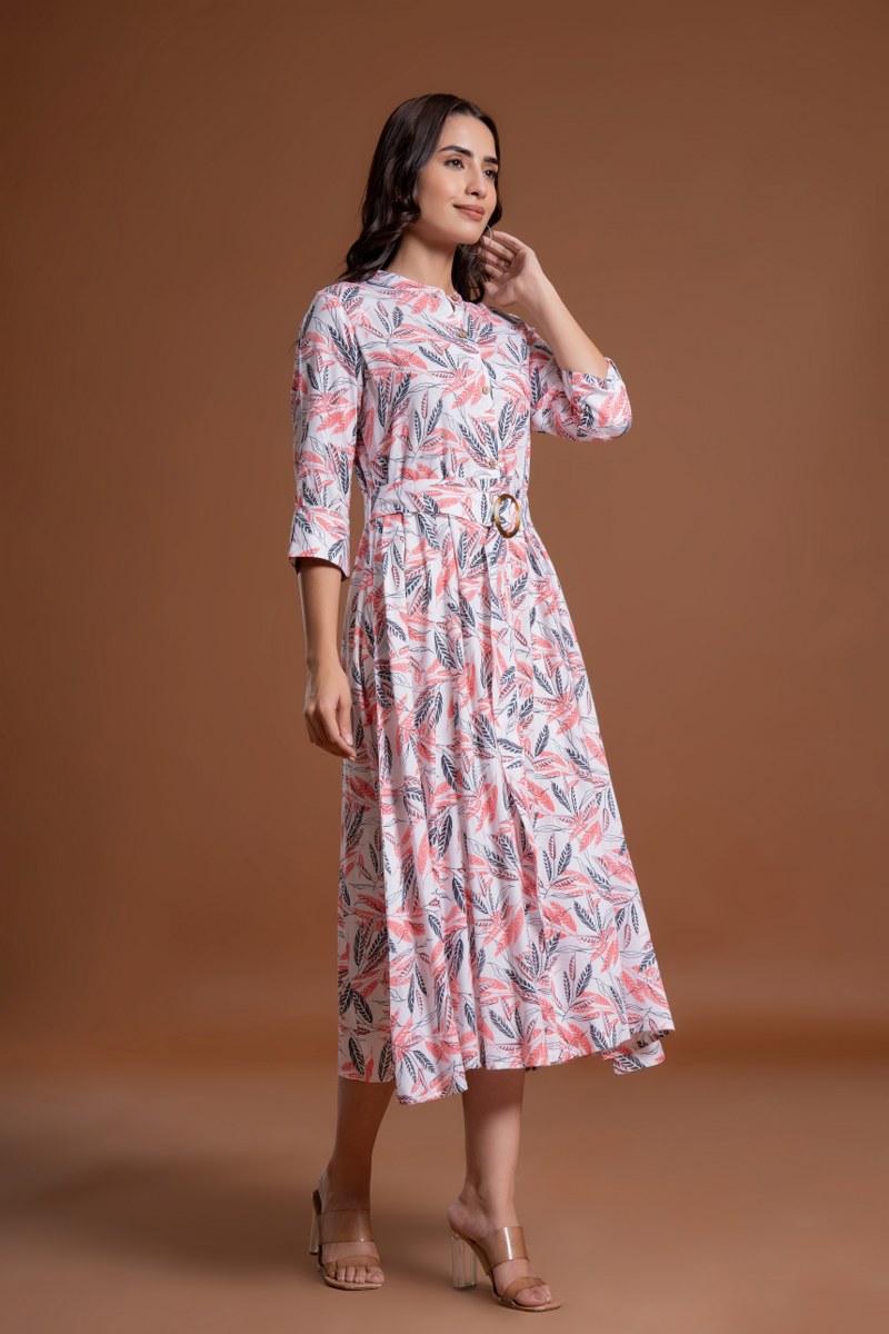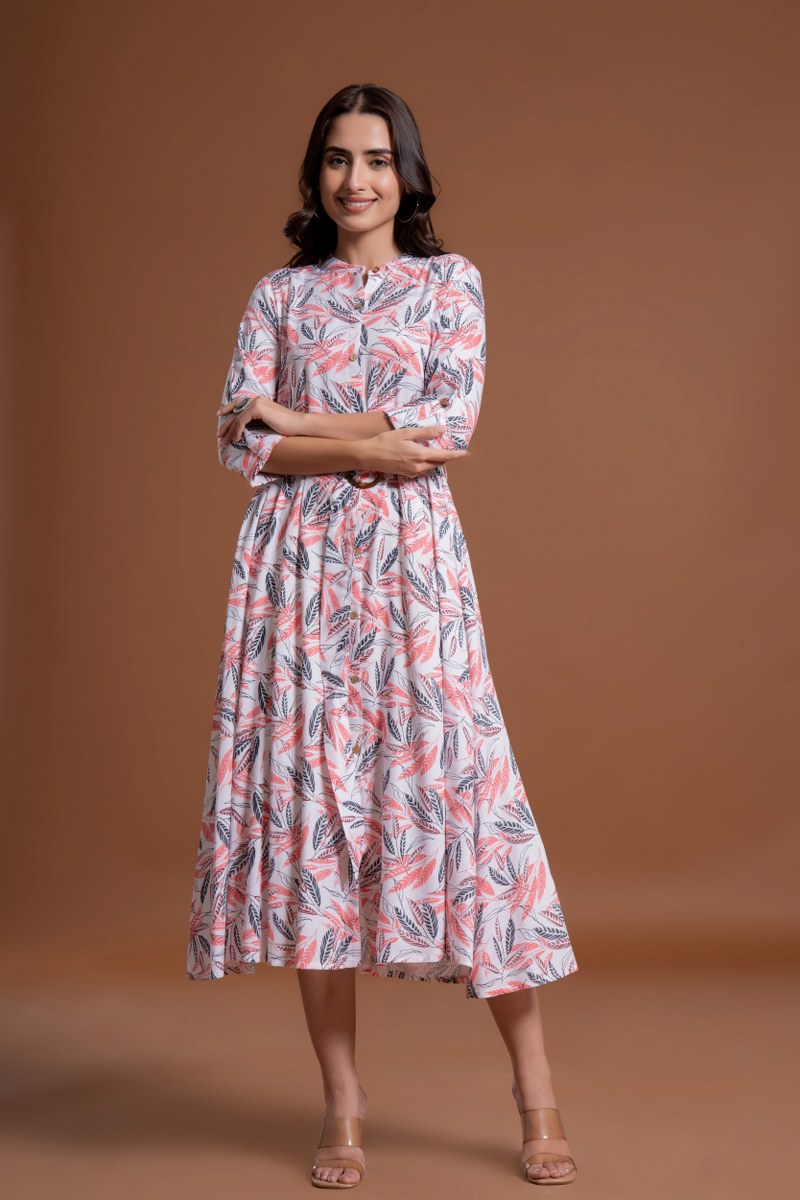 Add a refreshing and feminine touch to your wardrobe with this white and coral leaf print belted midi dress. Featuring a button-down front, 3/4th sleeves, and a round neckline with a V-slit, this dress combines elegance and comfort. The belt with a circular buckle cinches the waist for a flattering fit, while the flared A-line silhouette adds flow and movement. Perfect for brunches, casual outings, or semi-formal occasions.