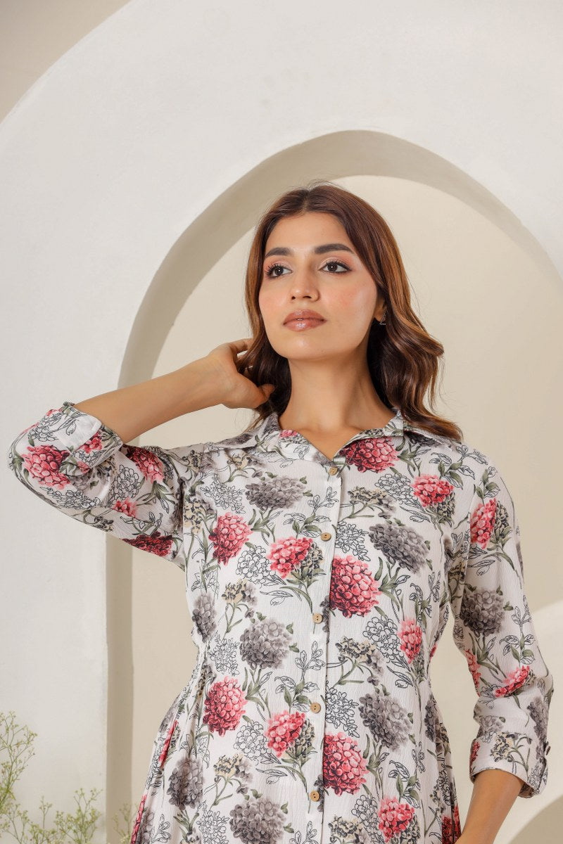 Step into effortless style with this white floral printed shirt midi dress. Featuring a button-down front, shirt collar, and 3/4th sleeves, this dress combines elegance with a touch of casual sophistication. The soft floral prints in shades of red and grey add a refreshing vibe, making it ideal for brunches, day outings, or semi-formal occasions. Pair it with strappy sandals or heels for a chic look.