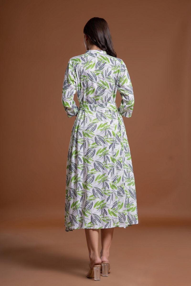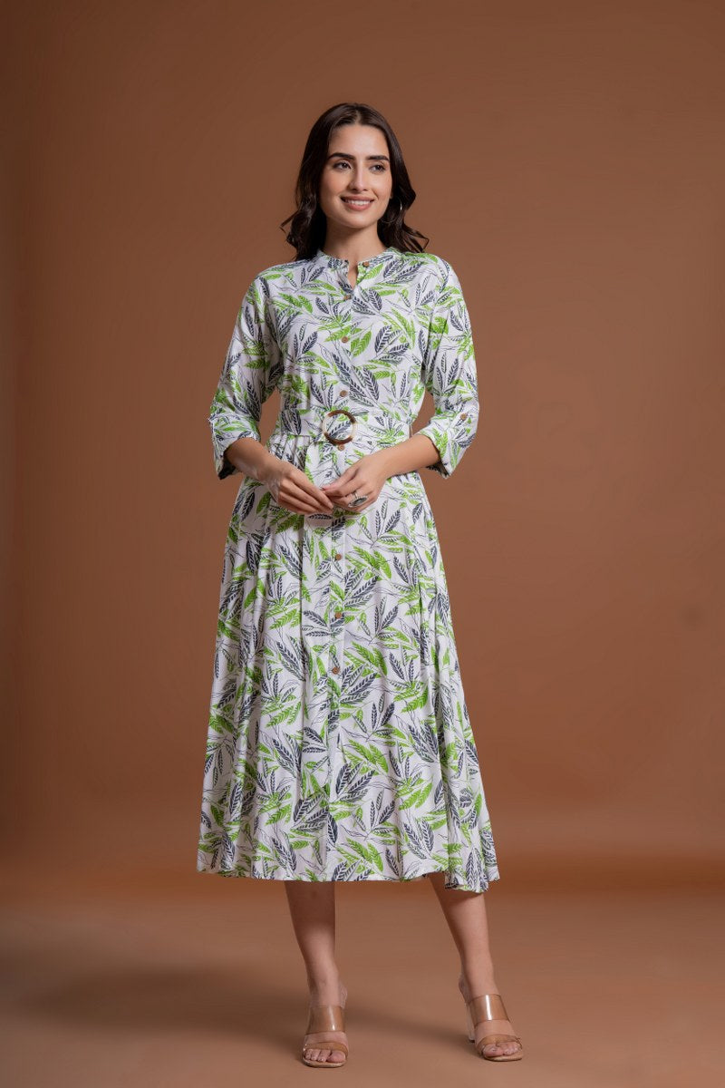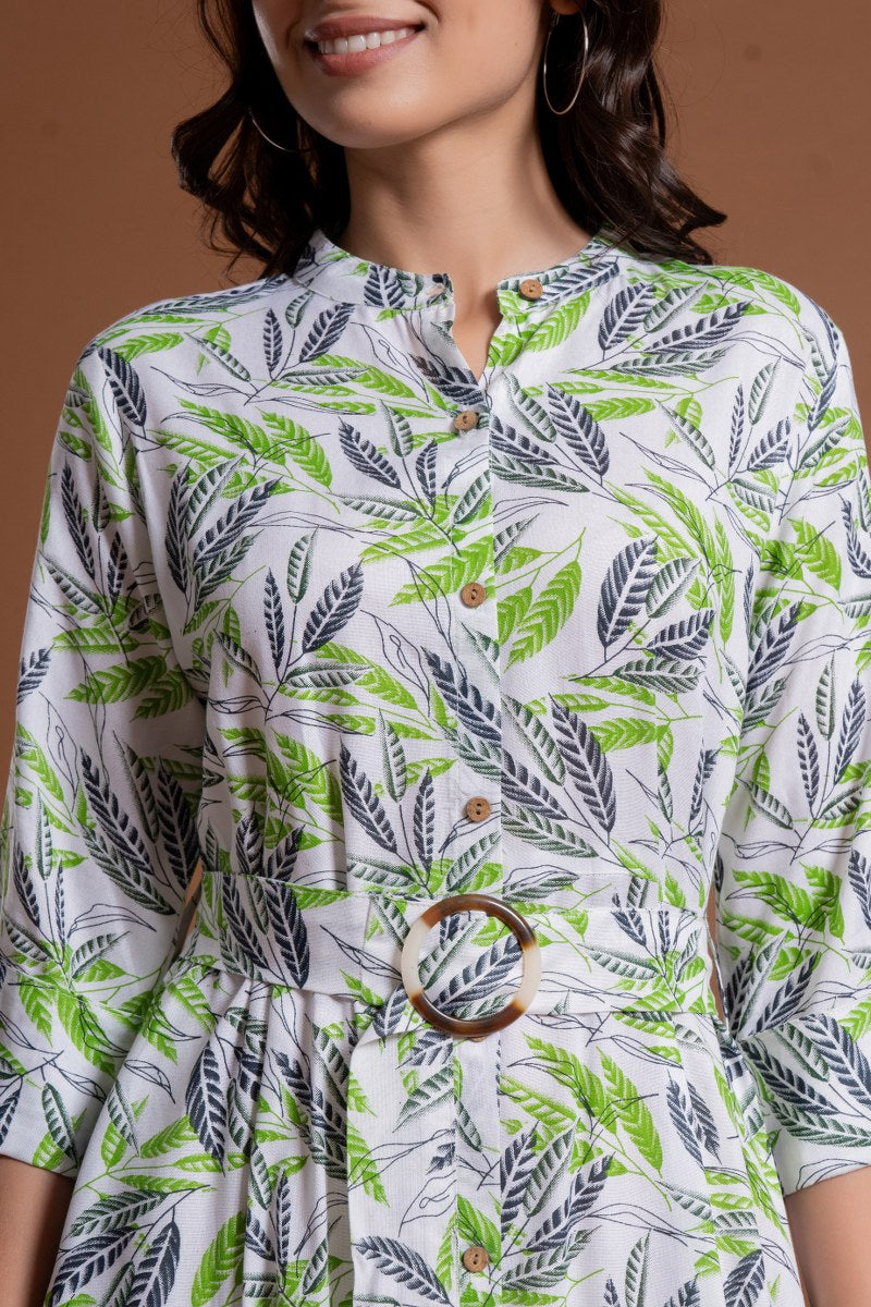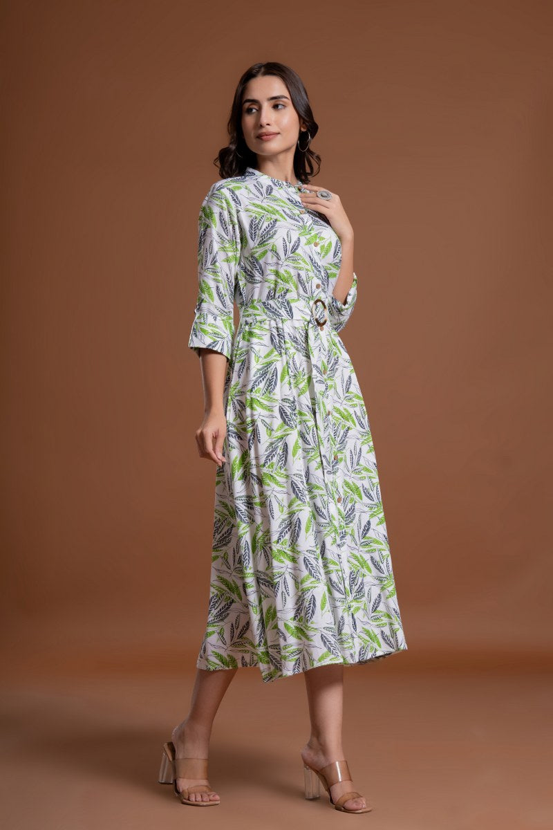 Freshen up your wardrobe with this white and green leaf print belted midi dress. Featuring a button-down front, 3/4th sleeves, and a round neckline with a V-slit, this dress is both chic and comfortable. The waist belt with a circular buckle accentuates your shape, while the flared A-line silhouette adds a graceful flow. Perfect for brunches, summer outings, or semi-formal occasions, this dress is an instant style upgrade.