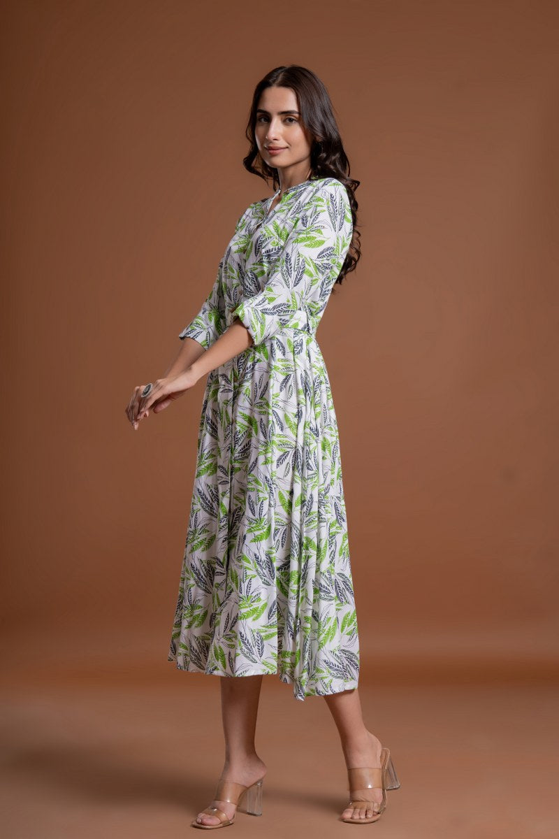 Women's White & Green Leaf Print Belted A-Line Midi Dress