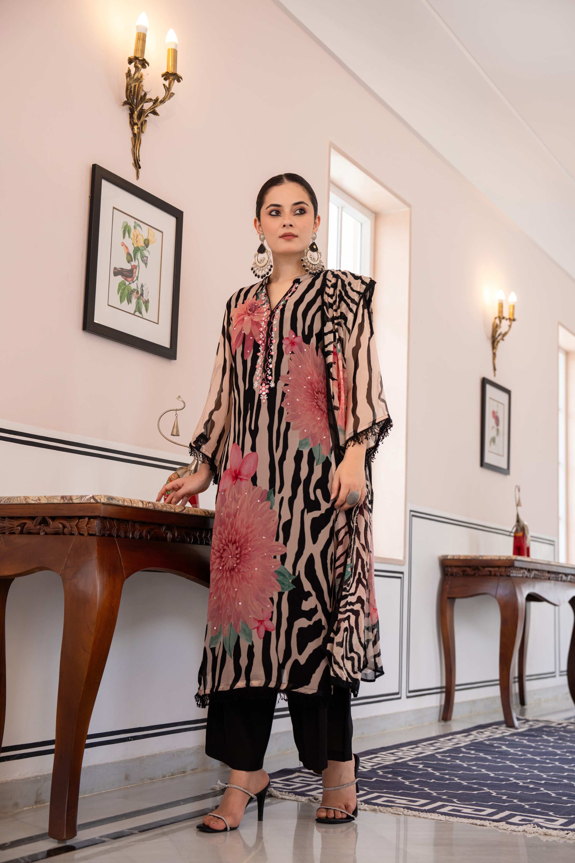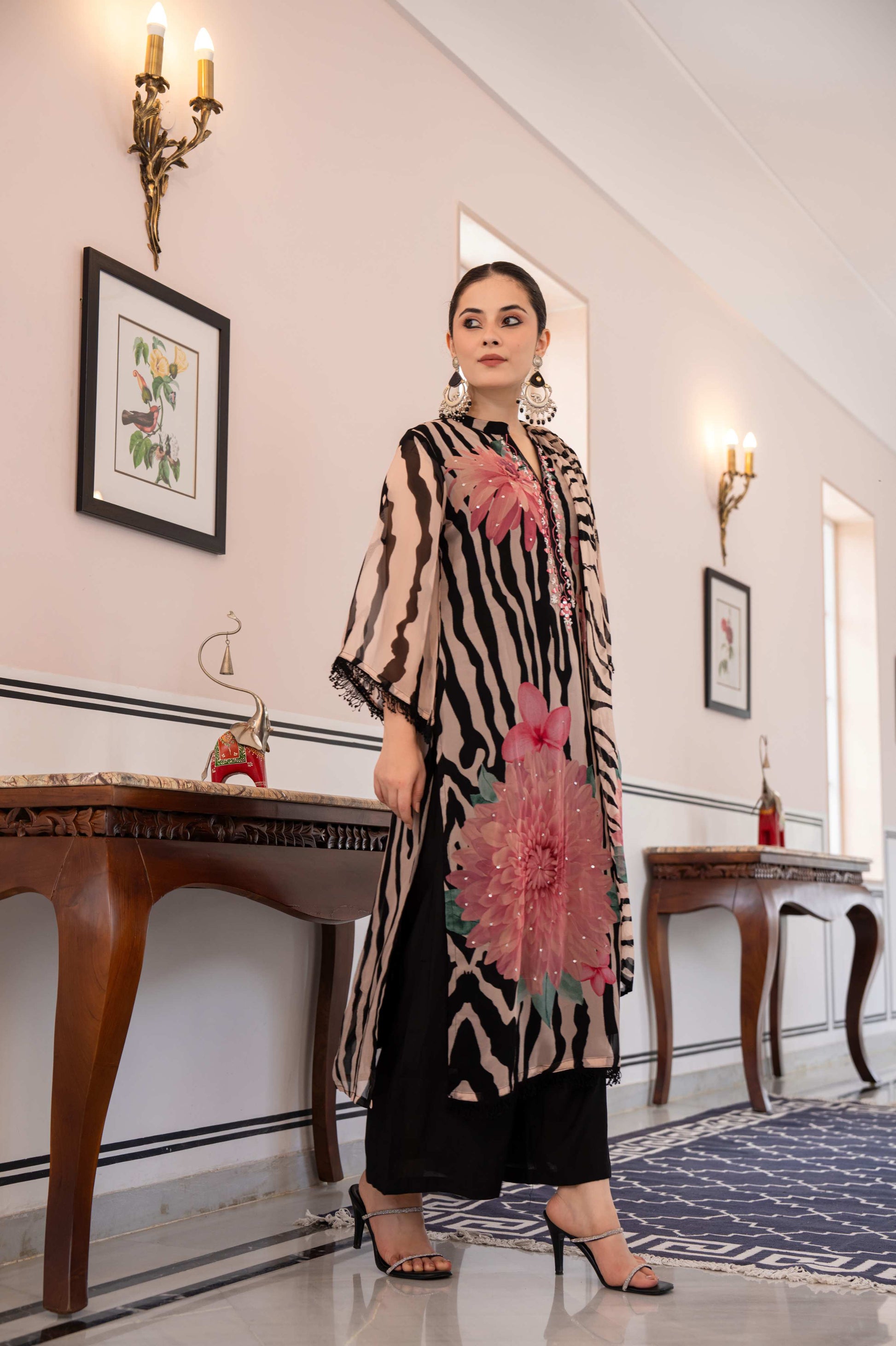 Unleash your bold and contemporary charm with this zebra-striped floral 3-piece suit set, designed to elevate your festive and evening wardrobe. Crafted in premium organza fabric, the kurta features a statement black and beige zebra print layered with oversized coral-pink floral motifs for a dramatic yet elegant fusion.